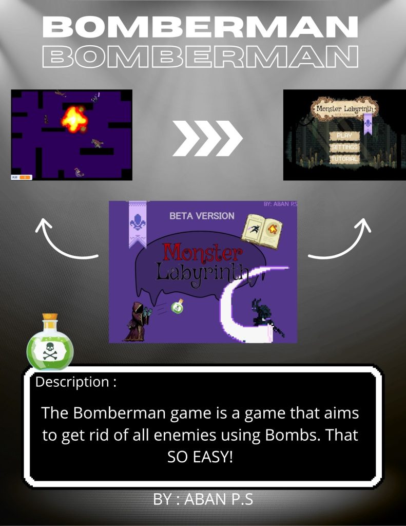 So, now I’m making a game called Bomberman. The goal of the game is to kill all the enemies in the game. This game is very easy: you only need to kill 10 enemies. If you get caught by an enemy, you die. And if your total kills exceed 10, you win the game. Not only that! Remember, if you get hit by a bomb you drop (kill yourself), if you kill yourself, you will DIE. Easy, right? Let’s try playing the game now!